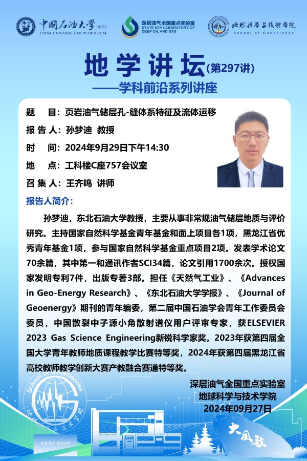 【地学讲坛第297讲】关于孙梦迪教授《页岩油气储层孔-缝体系特征及流体运移》学术报告的通知