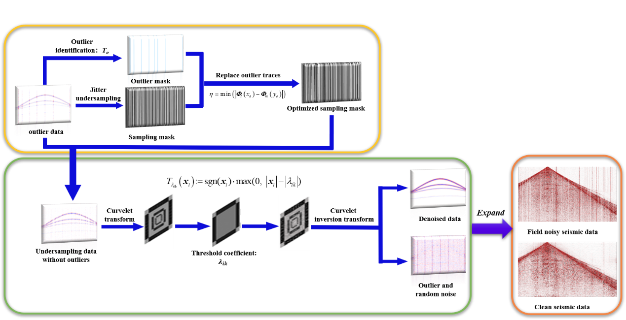 异常值噪声通常是指在幅度上与有效信号显著不同的一个或一组波形。在地震数据处理中,离群点的出现会导致数据的总体统计误差很大,且地震数据不同于图像,常规反演去噪方法无法对存在异常值噪声的数据进行有效压制。为了解决这一问题,太阳成集团tyc151cc杨继东教授团队系统开展了一种基于统计学优化的离群噪声压制方法,并将其结合到压缩感知(CS)框架中。首先利用地震数据振幅标准差的均质性统计,来分析识别离群噪声道的位置。将异常道位置与jittered采样生成的掩模矩阵进行对比,并将具有异常噪声的抖动掩模的采样道替换为它们附近的未采样道(图1)。优化的采样矩阵使我们能够在不破坏稀疏采样率的同时,有效地识别和剔除离群信号。这种优化的掩模策略将离群去噪问题转化为数据重构问题。利用软阈值迭代求解算法求解稀疏约束反问题,恢复零值位置处的信号(图2)。该研究所提方法的去噪效果整体上优于传统的f-x反褶积和中值滤波方法,能够准确地压制野值噪声,恢复丢失的期望信号。