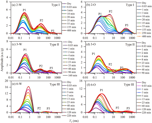 图1.页岩动态自吸水(W 代表水,左图)和油(O 代表油,右图)核磁T2谱。
