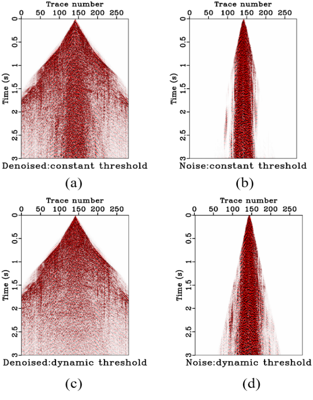 图2.去噪结果对比 (a)常阈值去噪结果;(b)常阈值噪音剖面;(c)动态阈值去噪结果;(d)动态阈值噪音剖面