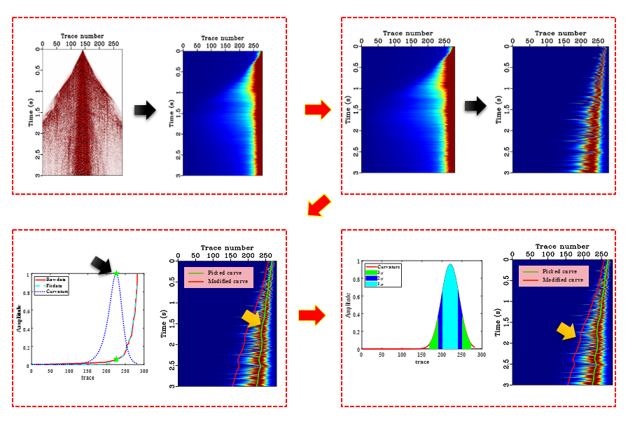近震源噪音通常是指在分布在震源附近,并且在振幅强度上与有效信号有显著差别的一类特殊噪音,鉴于地震资料处理领域所处理的波形信号有其特定的物理意义,因此常规去噪方法在面对含有异常振幅噪声的数据时,难以实现有效的噪声抑制。为了解决这一问题,太阳成集团tyc151cc杨继东教授团队创新发展了一种基于时频域动态阈值的近震源强噪音压制方法(图1)。首先分析了该噪音的特征,并据此针对性的制定策略,然后挖掘地震数据中近震源噪音和有效信号的差异信息,提取沿横向的振幅拐点并据此构造动态阈值曲线,在时频域的每一个频率面上自适应地计算阈值,并据此对数据做软阈值处理,最后变换回时间域得到近震源噪音衰减的有效信号。实际数据测试结果表明,该方法优于传统方法,有效压制数据中的强噪音,提升数据信噪比(图2)。