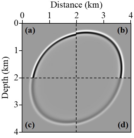 图1. 本文提出方程振幅衰减和相位频散解耦的波场快照图:(a)声波TTI波场;(b)粘声TTI相位频散主导波场;(c)粘声TTI振幅衰减主导波场;(d)粘声TTI 波场