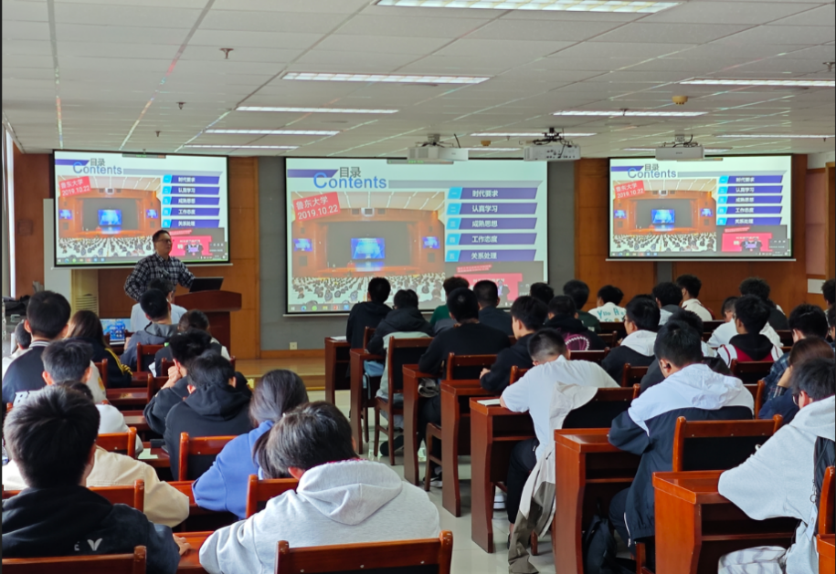刘玉强围绕大学生成长成才之路,从时代要求、学习态度、思想准备、工作态度、关系处理等五个方面展开。