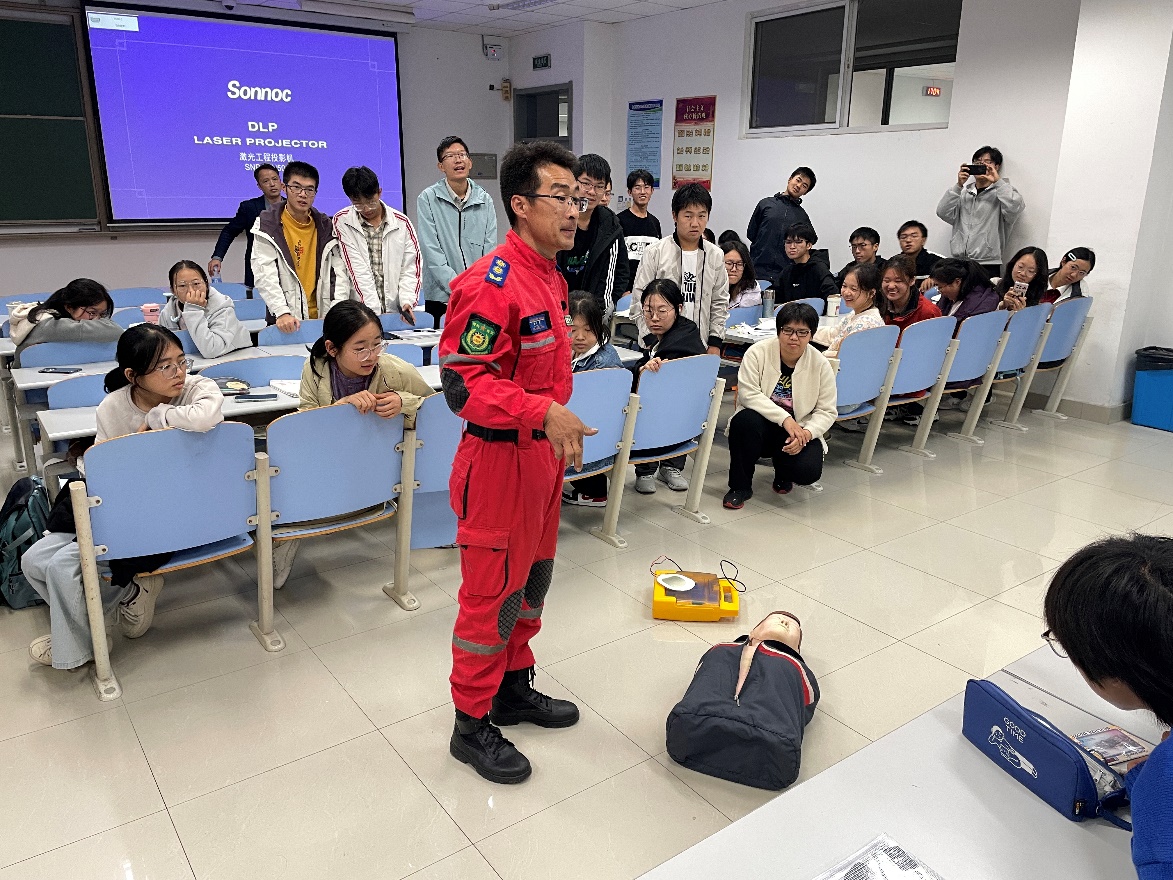 讲座特邀青岛西海岸新区“山海情”救援联盟薛成瑾队长担任授课嘉宾。薛队长结合多次国内地震救援实例,从地震基础知识、科学避震要点、自救互救技能等方面进行了详细讲解,对学生重点培训了环境安全确认、意识与生命体征判断、胸外按压的精准操作、人工呼吸的技巧以及AED除颤仪的实操要领。讲座上,学生们展现出了极高的学习热情和强烈的求知态度,踊跃与薛队长进行互动交流。