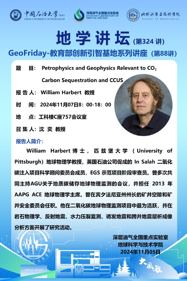 【地学讲坛第324讲】关于 William Harbert 教授《Petrophysics and Geophysics Relevant to CO₂ Carbon Sequestration and CCUS》学术报告的通知