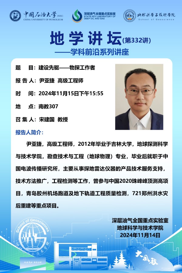 【地学讲坛第332讲】关于尹亚捷 高级工程师 《建设先驱——物探工作者》学术报告的通知