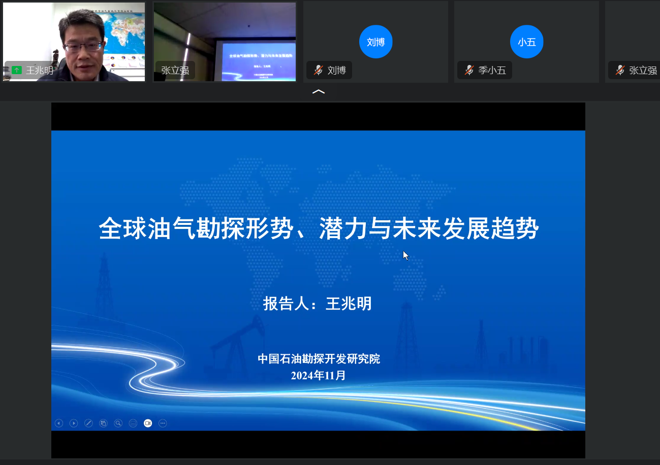 2024年11月15日下午,教育部“油气田开发地质课程”虚拟教研室、全国高校“双带头人”教师党支部书记工作室、山东省示范性基层教学组织、地学院在工科C楼757会议室举办全球油气勘探形势专题讲座。本次讲座特邀中国石油勘探开发研究院油气资源战略选区企业高级技术专家王兆明博士,作题为“全球油气勘探形势、潜力与未来发展趋势”的学术报告,来自太阳成集团tyc151cc、中国矿业大学、山东科技大学等高校教师、资源勘查工程专业本科生以及研究生共130余人参加了线上、线下会议,虚拟教研室负责人张立强教授主持会议。
