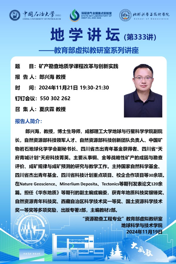 【地学讲坛第333讲】教育部虚拟教研室活动-关于郎兴海教授《矿产勘查地质学课程改革与创新实践》讲座的通知