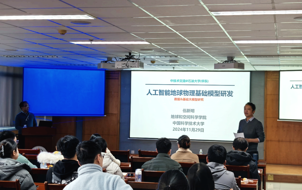 11月29日下午,学院在工科楼C座757报告厅举办了地球物理领域人工智能专题报告,斯坦福大学研究科学家刘明亮博士,VIRIDIEN(原CGG)人工智能实验室负责人侯嵩博士,中国科学技术大学伍新明教授三位地球物理领域人工智能专家齐聚地学讲坛,为我院师生开展学术报告,分享未来人工智能在地球物理领域的前沿发展方向。曹丹平教授主持报告,学院100余名师生参加报告会。