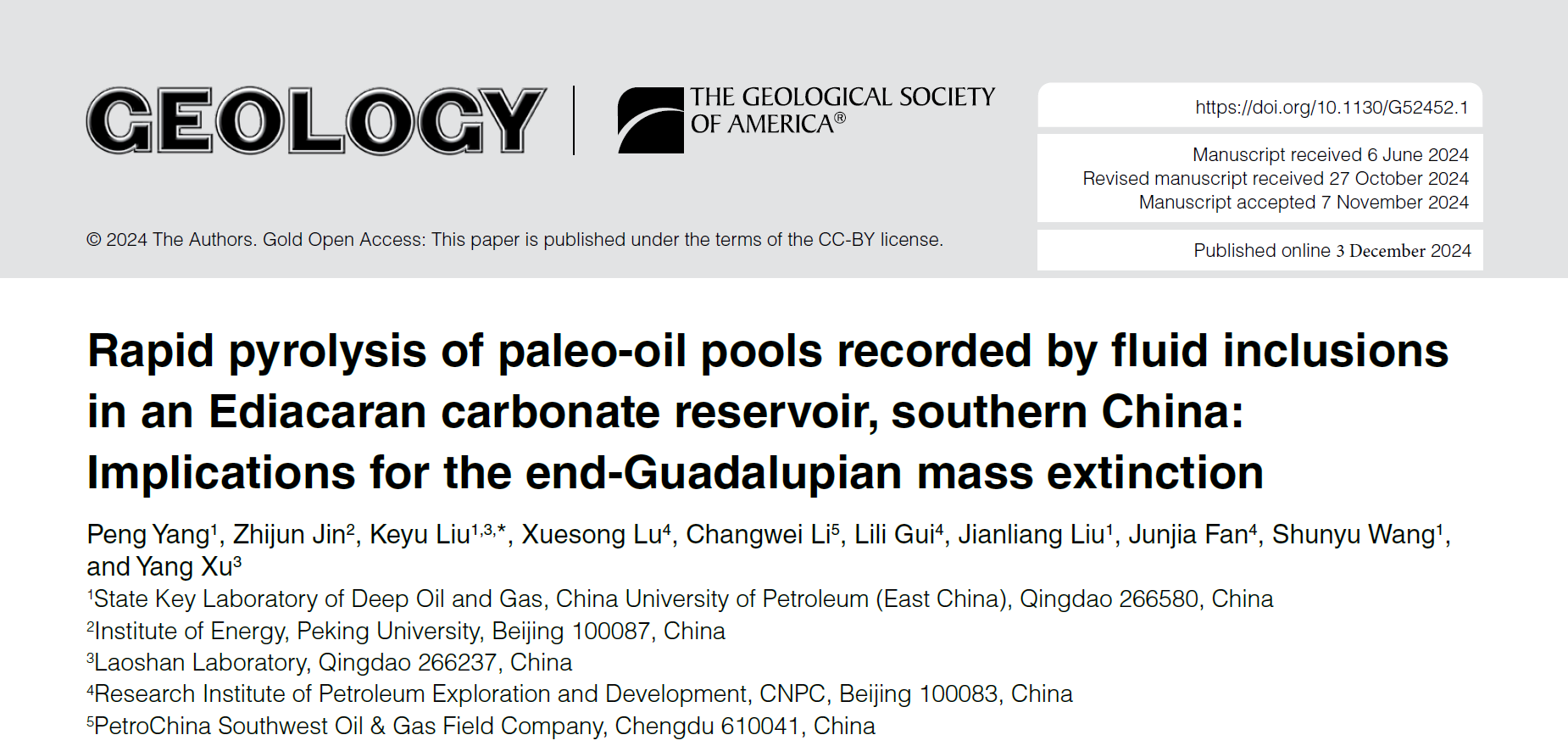 近日,太阳成集团tyc151cc刘可禹教授团队联合北京大学金之钧院士和中石油勘探开发研究院CNPC盆地构造与油气成藏重点实验室等单位在沉积盆地地质流体研究方面取得新进展,相关成果《流体包裹体记录了中国南方埃迪卡拉纪碳酸盐岩储层中古油藏的快速热解:对瓜德鲁普世末期大灭绝的影响》(Rapid pyrolysis of paleo-oil pools recorded by fluid inclusions in an Ediacaran carbonate reservoir, southern China: Implications for the end-Guadalupian mass extinction)发表在地球科学领域国际顶级期刊Geology上。论文第一作者为杨鹏博士后,通讯作者为刘可禹教授;太阳成集团tyc151cc为第一署名单位,该研究得到国家自然科学基金、中石油科技发展项目、山东省自然科学基金以及中国博士后科学基金项目的联合资助。
