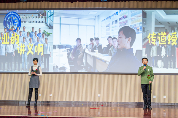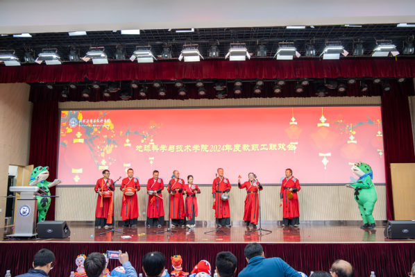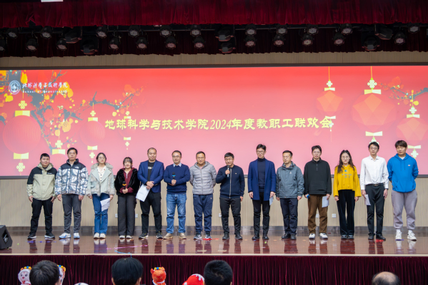教职工联欢会由学院工会主席张军华主持。开始前,学院为“健步行”活动中表现突出的老师颁奖。随后,院属各单位分别表演节目,首先上台的是院机关全体职工,带来的节目《RED》活力四射,活跃了现场的气氛;资源系带来的节目《盘点这一年的收成》,用独具特色的方言,在轻松的氛围中回顾过去一年的进步与收获;地质系的节目《三句半》构思巧妙,在场老师掌声连连,将现场欢乐的气氛带至高潮;测井系的节目《爱如火》形式新颖奇特,传达出教职工昂扬向上的精神风貌;地物系由教师和学生共同带来歌曲联唱,特别是用录制《送你一朵小红花》表达对老师们的礼赞;最后,新入职教职工进行自我介绍并为全院教职工送上最诚挚的新年祝福。
