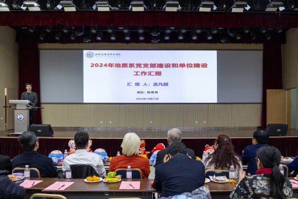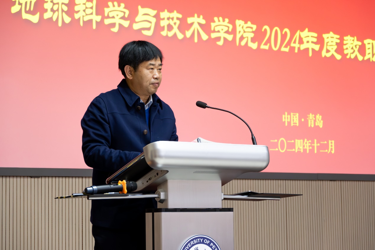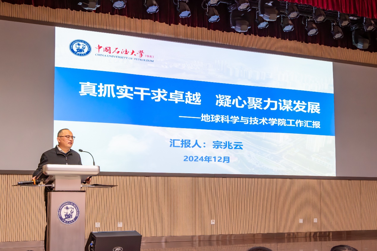 宗兆云作题为《真抓实干求卓越,凝心聚力谋发展》的学院工作报告,全方位总结和回顾了2024年学院奋力推进新一轮“双一流”建设所取得的丰硕成果和2025年奋斗的愿景目标。他表示,2024年学院加强党的全面领导,持续推动“一融双高”,事业发展取得突破性进展。深层油气基础研究能力显著提升,有组织科研助力立项转化实现重大突破;学术科研氛围进一步浓厚,学术成果取得多项新亮点;加大人才引育力度,师资队伍建设取得新进展;思政引领强基铸魂,人才培养成果斐然;人才培养平台上新高,本科生源质量大幅提升;持续完善研究生教育体系,培养质量显著提升;全力打造国际交流地学品牌,国际化水平提升明显;深化学院办公室改革,建设一流管理服务团队;全院教职工凝心聚力,多项活动赛事拔得学校头筹。面向2025年,学院将持续推进“地十条”,落实“3+N+特色(亮点)”工作方案,开展“十大行动”,大力推动学院学科可持续发展。