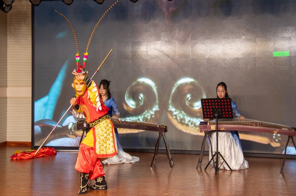 从手风琴悠扬的旋律奏响,到古筝弦音的婉转流淌、葫芦丝的清幽之音袅袅回荡;从中国武术的刚健有力、特技表演的惊险刺激、秧歌的质朴欢快,再到啦啦操的青春跃动、各类舞蹈的缤纷多彩,在本次联欢会中,石油大学的学生携手社区居民及其工作人员共同呈现出了一场精彩纷呈的视听盛宴。在众多精彩节目中,由石油大学学生和珠光路社区杨军共同带来的古筝演奏+美猴王表演《云宫迅音》别具一格,将古筝行云流水般的弦音与美猴王齐天大圣的灵动活泼、机智勇敢巧妙融合,传统乐器的优美旋律与经典角色的生动演绎相得益彰,让人不禁沉浸其中,感受着传统艺术与经典形象碰撞出的独特魅力。