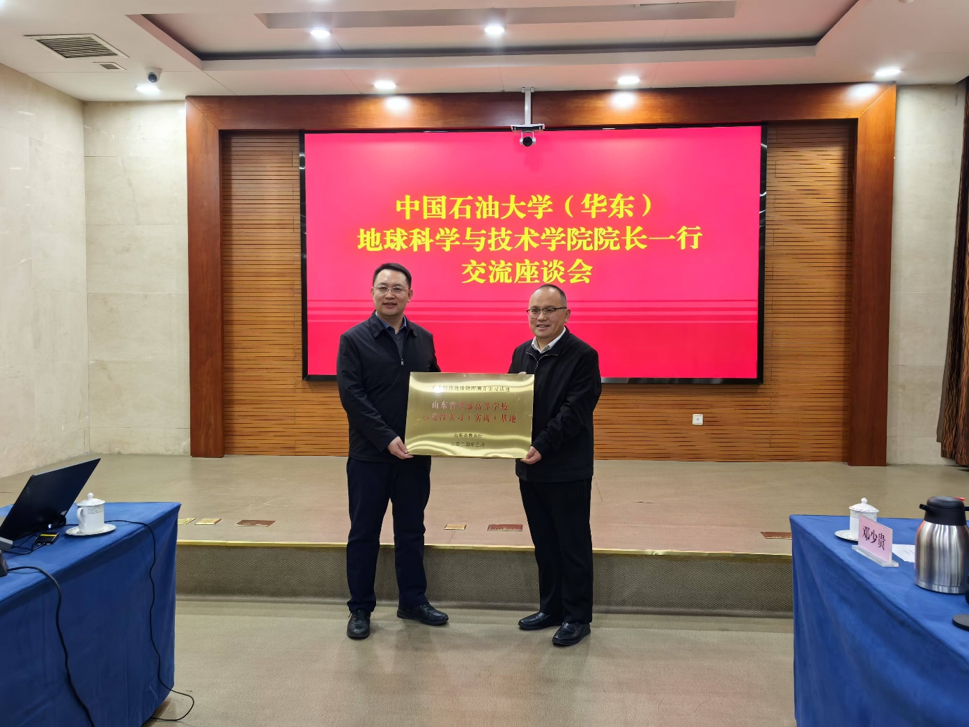 会上,苏远大简单介绍了学院基本情况及2024年度取得的“十大进展”,双方围绕校企优势特色,畅所欲言,进行了深入细致交流,并达成广泛共识。期间,宗兆云和华承金共同为“石大经纬地球物理测井”山东省示范性实习(实训)基地揭牌。会后,宗兆云一行参观了岩石物理实验室。