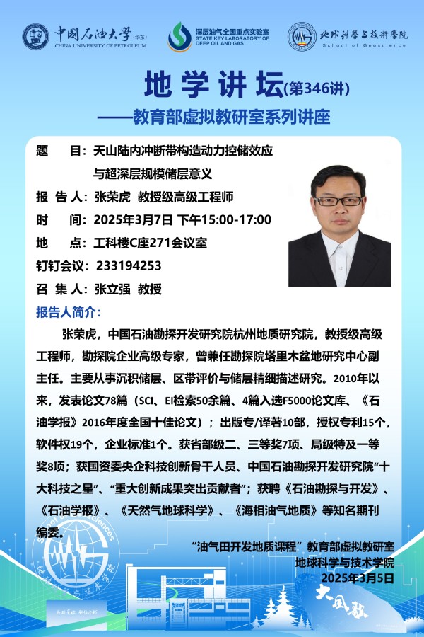 【地学讲坛第346讲】教育部虚拟教研室活动-关于 张荣虎 教授级高级工程师 《天山陆内冲断带构造动力控储效应与超深层规模储层意义》讲座的通知