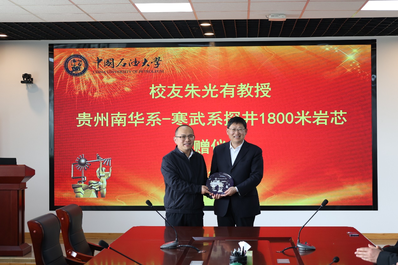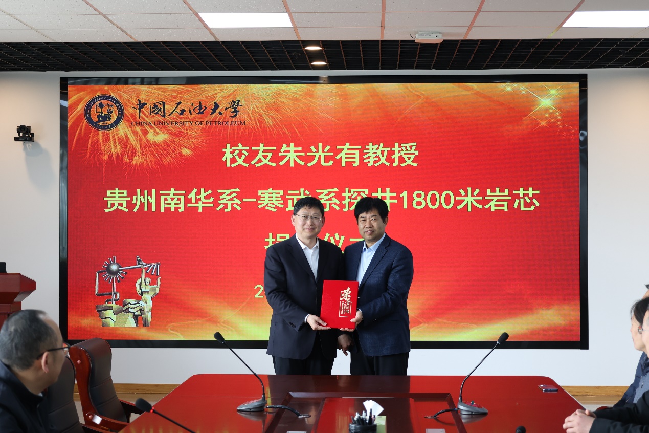 朱光有对学校和学院在自己成长过程中一直给予的支持表示感谢。指出本次捐赠的南华系-寒武系岩芯是四川盆地和塔里木盆地万米深井钻探的主要目的层系,三套黑色页岩(烃源岩)和两套白云岩是超深层的典型代表岩层,希望通过对这1800米连续岩芯的研究能为学院科研和教学提供更多的素材。