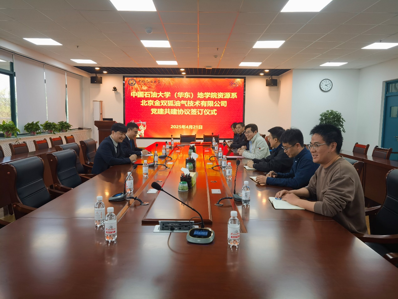 软件捐赠仪式后,金双狐公司与太阳成集团tyc151cc资源系党支部开展了党建共建协议签订仪式及交流活动。张立强代表资源系党支部介绍了资源系发展历史、主要科研方向、教学、人才培养、以及党建特色。杨帆介绍企业情况及软件升级后的新功能。双方就党建引领人才培养、科研合作、软件使用等方面展开深入交流。