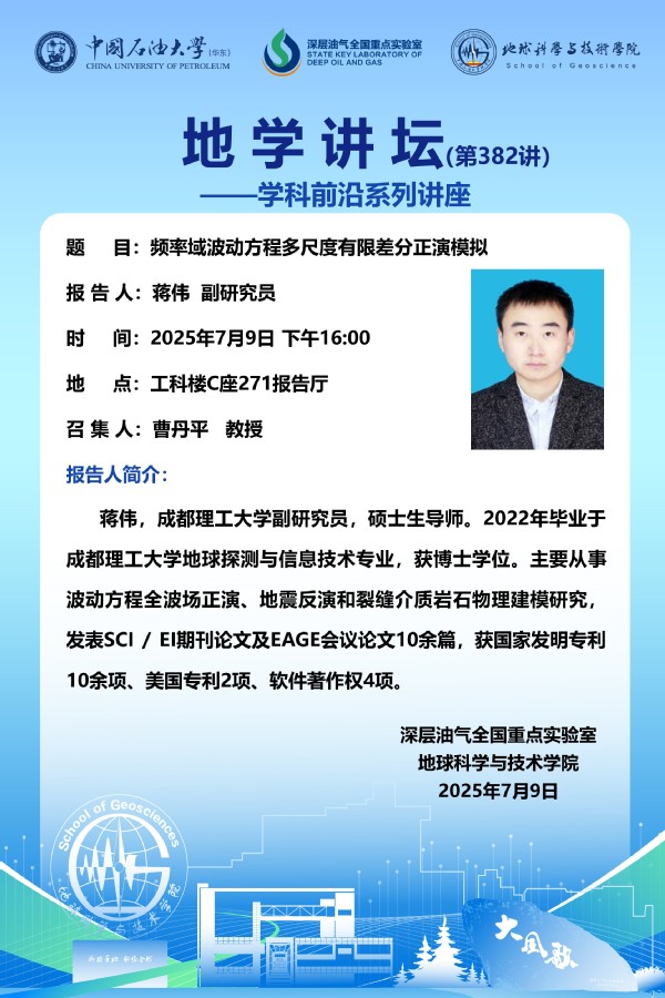 【地学讲坛第382讲】关于蒋伟 副研究员《频率域波动方程多尺度有限差分正演模拟》学术报告的通知