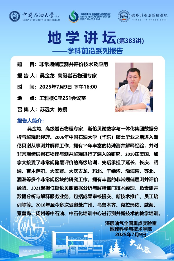 【地学讲坛第383讲】关于吴金龙 高级岩石物理专家《非常规储层测井评价技术及应用》学术报告的通知