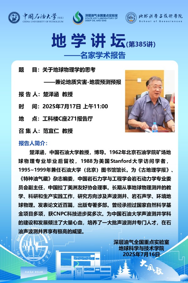 【地学讲坛第385讲】关于楚泽涵 教授《关于地球物理学的思考——兼论地质灾害-地震预测预报》学术报告的通知