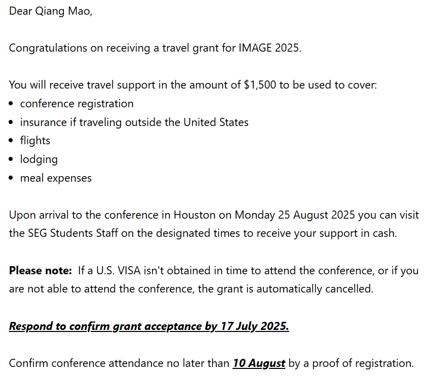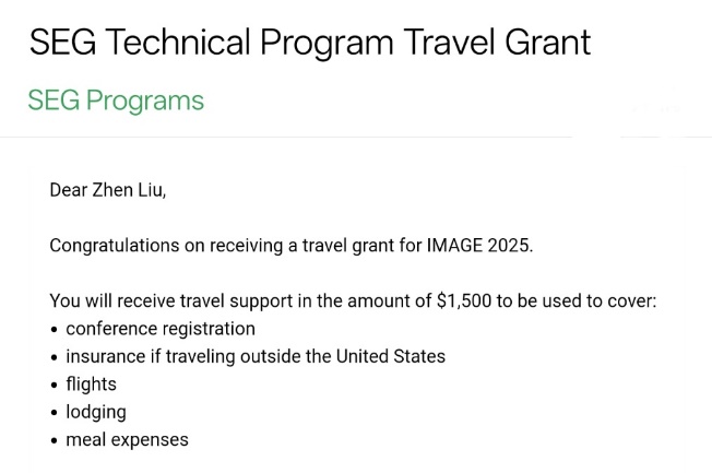 SEG Travel Grant是SEG专门面向全球优秀青年学者设立的专项学术资助项目,具有极高的国际认可度和学术含金量。该奖项每年面向全球所有申请者公开遴选,竞争激烈,获奖比例极低。此次2名博士研究生获奖并受邀参加2025年IMAGE会议,不仅彰显了我院研究生在地球物理领域的学术实力和国际竞争力,也为我院与国际顶尖学会及学者的深入交流与合作搭建了桥梁。