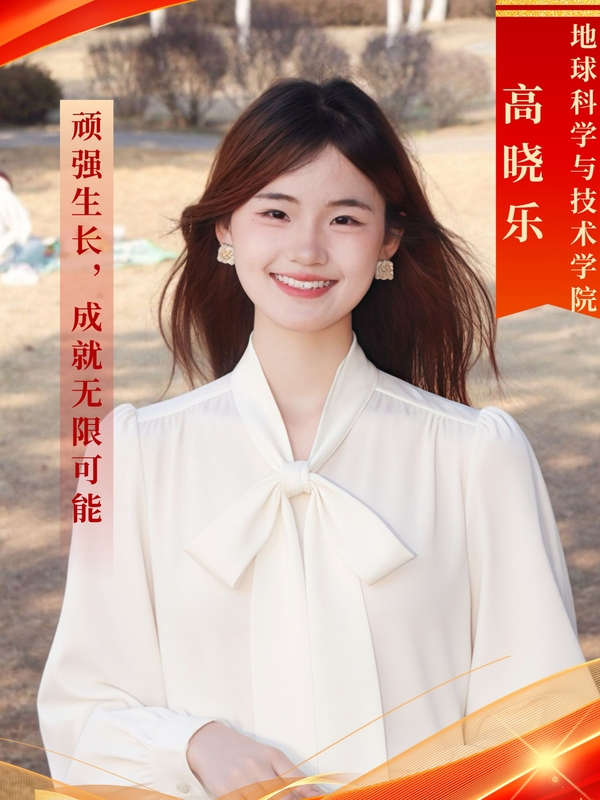 高晓乐,女,中共预备党员,地质学专业2022级本科生。现任春晖志愿服务队主席团成员。学习成绩优异,50门课程在90分以上,综合成绩排名专业第一,获第八届全国油气地质大赛一等奖、国家奖学金、塔里木油田奖学金等荣誉。热心公益,带头牵动地学科普工作,任职期间组织70余次志愿活动,带队赴内蒙古科左后旗开展支教助学活动,主持的地学科普项目入选第十届全国大学生暑期实践展示活动,并获评全国大学生科技志愿服务优秀项目,个人获评五星级志愿者(全校当年仅五例)。热爱运动,连续2年包揽校运会女子3000m、1500m冠军,代表学校夺得青岛市高校运动会双项冠军并获“优秀运动员”称号。同时获青岛市千名优秀大学生、校思美之星、“美丽心灵·阳光石大”最美人物、优秀共青团干部等荣誉奖励60余项。