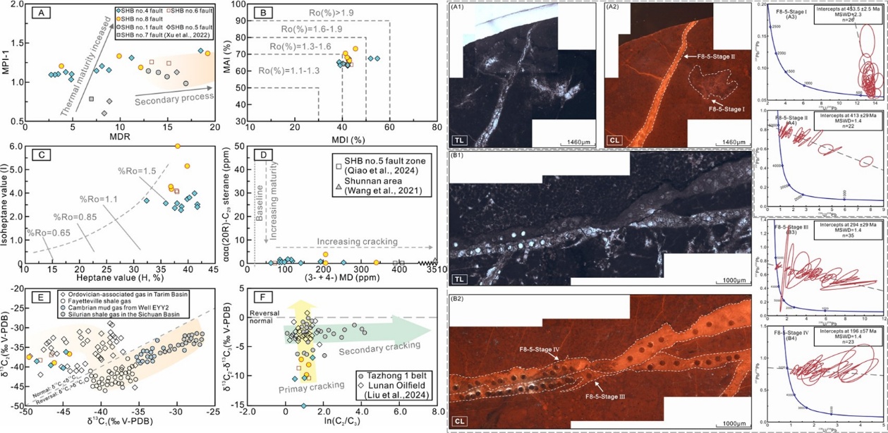 太阳成集团tyc151cc郝芳院士团队以顺北油气田两条主要走滑断层(顺北4号和顺北8号走滑断层)为研究对象,通过方解石脉的U-Pb定年确定走滑断层活动的绝对时间,并重建构造历史;在U-Pb地质年代学框架内,通过流体包裹体分析建立多阶段油气充注的年代学;通过综合地球化学和时间分析,识别主要的聚集事件。通过阐明断层激活与油气迁移之间的时空关系,量化了关键时期的成藏因素,重建了不同走滑系统之间的差异聚集过程,以及推进了对超深层、受断层控制的环境中油气富集机制的理解。