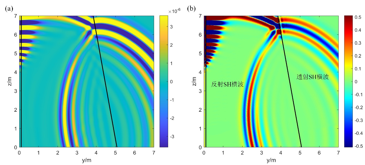 图1 yoz平面内4.3ms时刻反射和透射SH横波声场快照对比(a)有限差分;(b)解析解