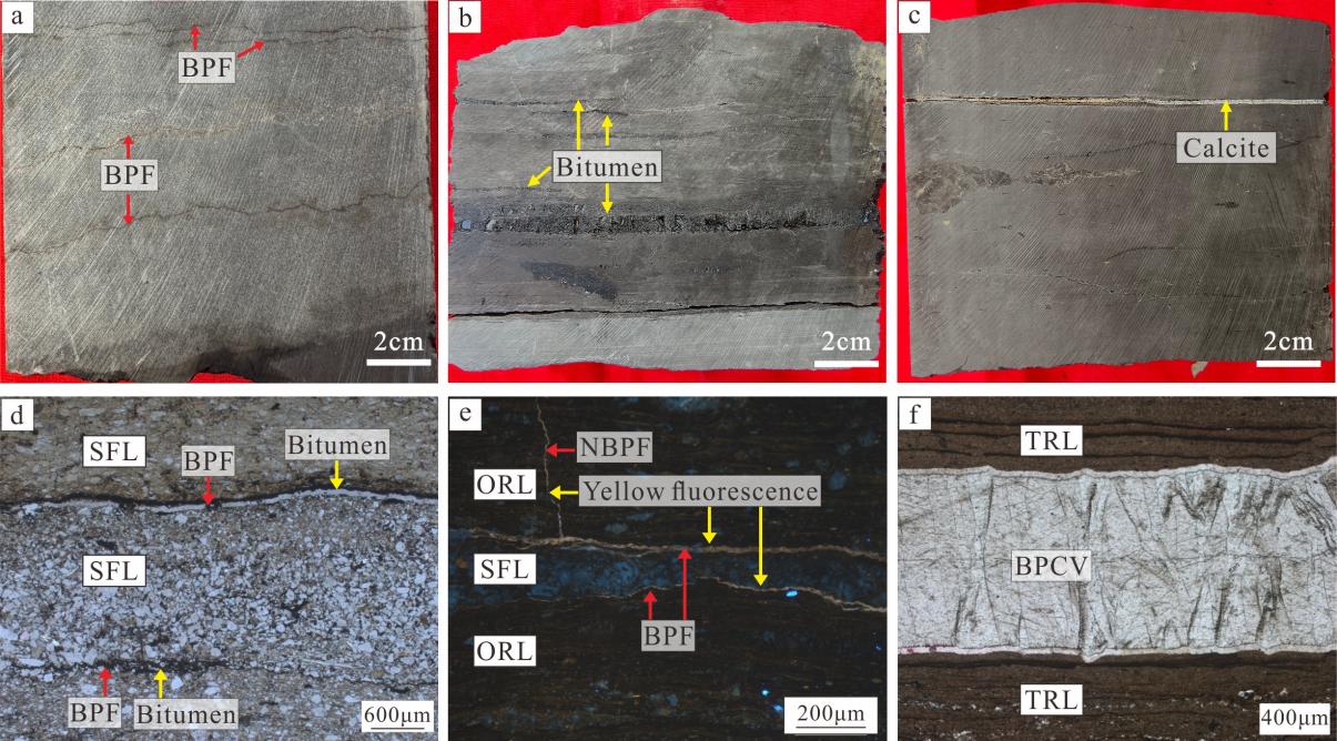 研究团队通过多尺度、多方法耦合研究发现纹层界面两侧矿物成分、排列及尺寸差异导致的力学各向异性是页理缝产生的必要地质前提。脉体微观结构和同位素地球化学分析结果表明顺层方解石脉记录了多期次流体活动,证明页理缝具有显著的幕式开启特征。由生烃超压所引起的垂直渗流力梯度会周期性地突破封闭页岩系统的压力阈值,从而导致薄弱界面的周期性开启,是页理缝的主要形成机制。相对封闭的湖相页岩系统中页理缝的幕式开启显著促进了流体流动和物质交换,影响了成岩演化和排烃,是对沉积盆地多尺度、幕式流体活动的重要响应。