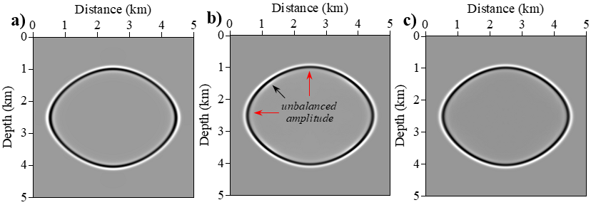 图1. 不同方法数值模拟结果对比:(a)参考解;(b)Xu等2015方法;(c)本文方法