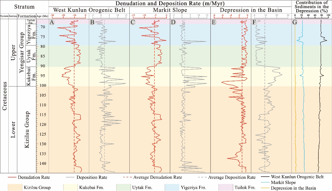 图3. 西昆仑造山带剥蚀(A)与沉积(B)速率、麦盖提斜坡剥蚀(C)与沉积(D)速率、坳陷剥蚀(E)与沉积(F)速率以及不同造山带物源供给占比(G)