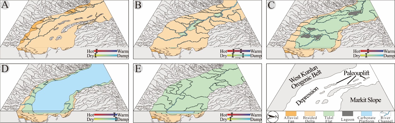 三叠纪时期,印支运动导致塔里木盆地南部边缘与甜水海地块碰撞,古特提斯洋闭合,强烈逆冲推覆作用致使坳陷内部形成一系列北陡南缓的推覆构造体,部分地区白垩纪地层直接覆盖于古生代地层之上,形成不整合接触。早白垩世时期,受甜水海地块拼贴作用影响,西昆仑造山带处于长期稳定隆升-剥蚀状态,沉积物通过山间河流搬运至坳陷内部,形成短轴辫状河三角洲沉积。该时期坳陷处于炎热干旱环境,沉积地层具有代表氧化环境的红色、红褐色特征。晚白垩世早期,受拉萨地块与甜水海地块南缘发生碰撞拼贴影响,造山带剥蚀速率迅速上升,受全球海平面上升影响,环境逐渐过渡为温暖湿润气候;晚白垩世中晚期, 拉萨地块拼贴基本完成,造山带隆升速率明显放缓;沉积物汇入量减少导致坳陷内沉积物以细粒沉积为主,沉积环境由辫状河三角洲环境转变为潮坪环境。