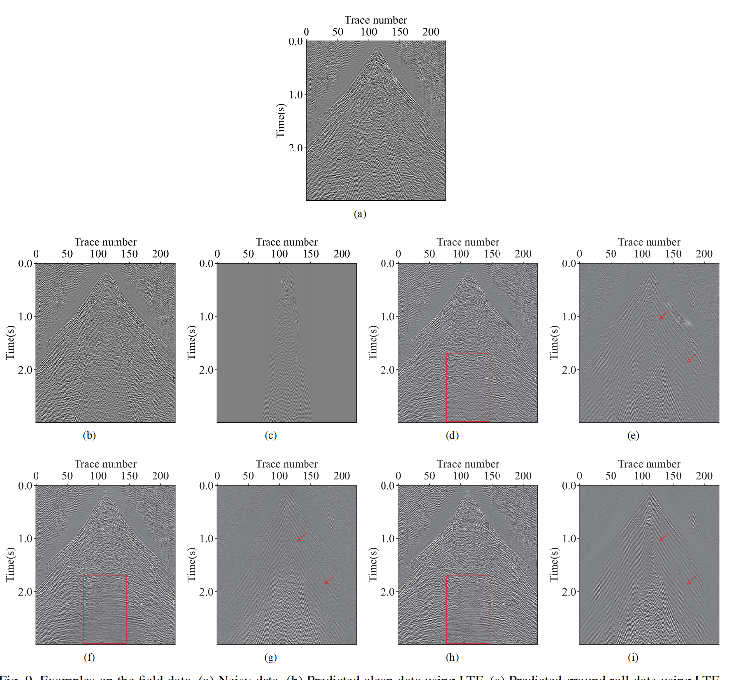 图3 基于Line 001实际数据的示例:(a)含噪数据,(b,c)基于 LTF 预测的去噪结果和面波数据,(d,e)基于 U-Net预测的去噪结果和面波数据,(f,g)基于 DDPM-1c预测的去噪结果和面波数据,(h,i)基于DDPM-2c预测的去噪结果和面波数据