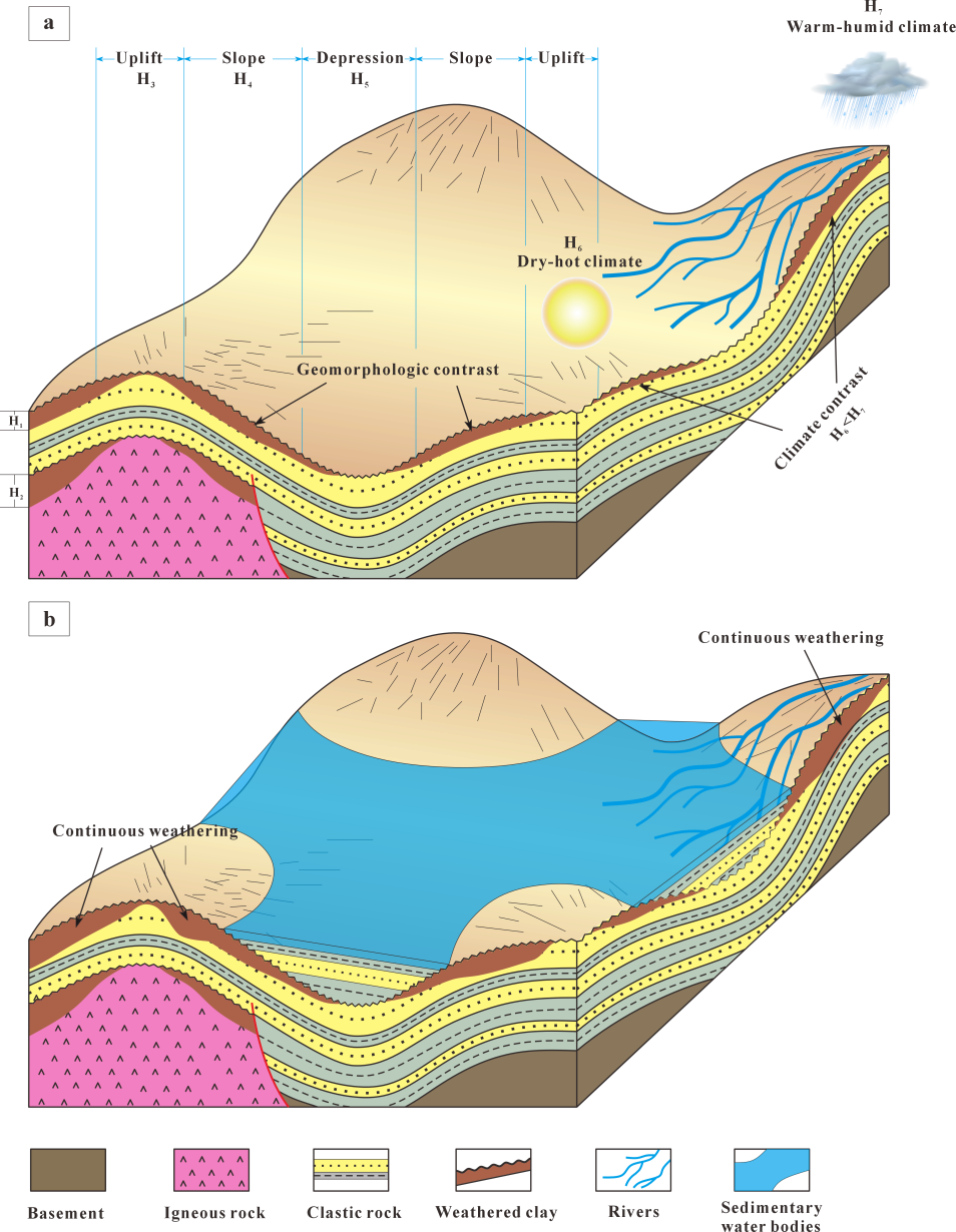 研究发现不同母岩类型在风化过程中表现出不同的风化特征和成分变化,进而影响风化黏土层的发育程度;温湿、氧化的条件更利于风化黏土层的形成和保存,盐度对风化黏土层的形成影响相对较弱;沉积间断时间的增加,有利于风化黏土层的发育,但二者并非线性关系;构造高部位风化剥蚀作用强,风化黏土层不易保存,洼陷带风化作用弱,不利于风化黏土层的形成,缓坡带则是风化黏土层形成与保存的有利区带(图2)。