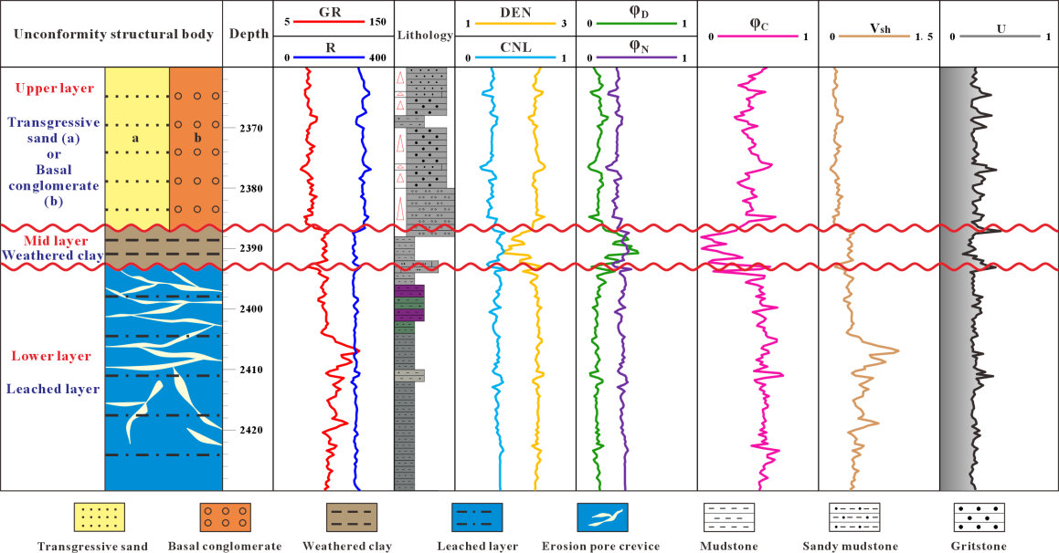 地层油气藏的形成和保存与不整合密切相关,不整合在油气运聚、储层改造、控制圈闭分布等方面发挥重要作用。不整合是一个内部结构复杂的地质体,包括底砾岩或水进砂体层、风化黏土层和风化淋滤带。其中,风化黏土层是不整合控制油气运聚的关键结构层。本研究通过广泛获取不同岩性区不整合风化黏土层的岩石样品,借助电子显微镜与扫描电镜鉴定、元素地球化学分析、全岩矿物分析、测井综合识别等方法,系统开展了不整合风化黏土层成分特征及主控因素研究。