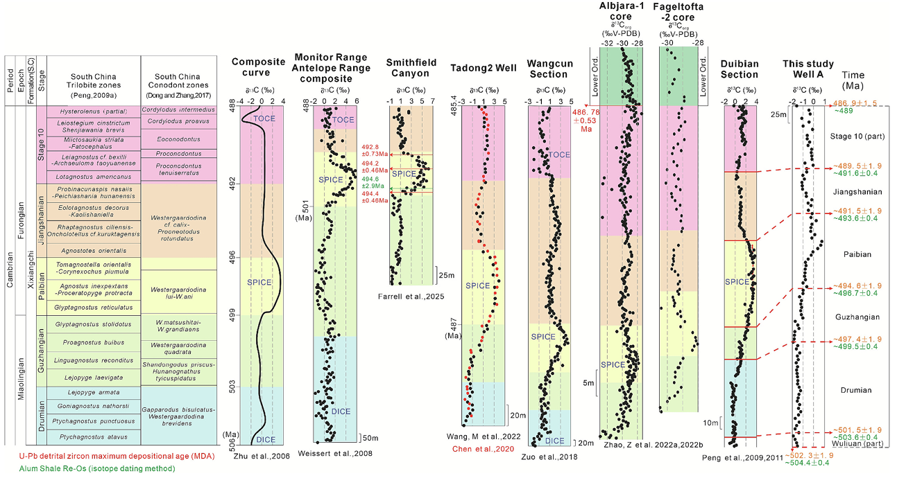 图1 四川盆地A井与全球参考剖面的碳同位素(δ¹³Ccarb)对比