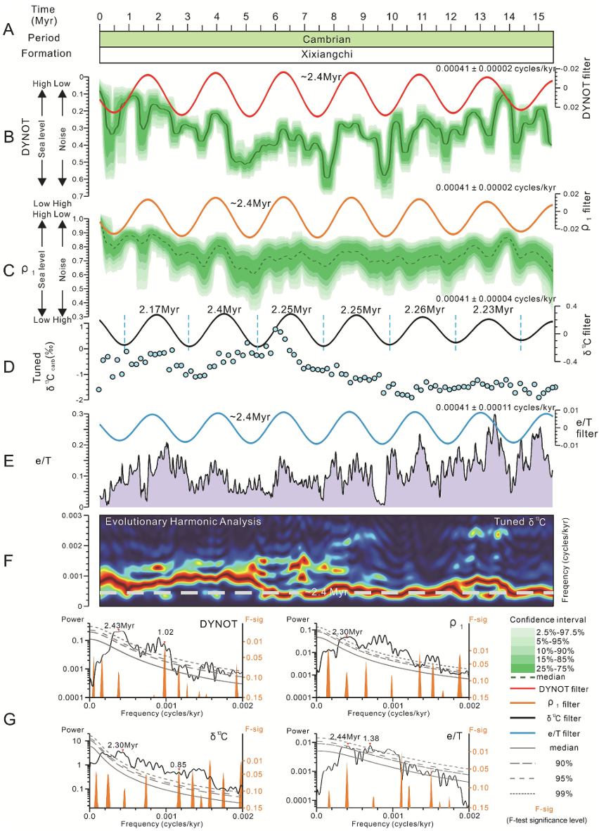 图2. (A) 四川盆地A井洗象池组时间标尺。(B) DYNOT模型及滤波后的~2.4 Myr周期。(C) p1模型及滤波后的~2.4 Myr周期。(D) δ¹³C及滤波后的~2.4 Myr偏心率周期。(E) e/T及滤波后的~2.4 Myr偏心率振幅调制周期。(F) 调谐后δ¹³C的演化谐波分析。(G) DYNOT、ρ1、δ¹³C和e/T的2π MTM功率谱