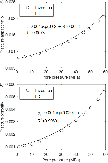 图2. 反演得到的(a)裂缝纵横比及(b)裂缝孔隙度随孔压变化的关系曲线