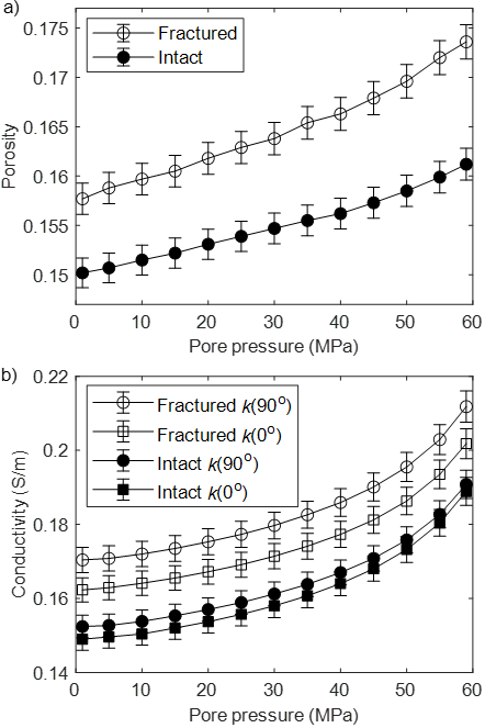 图1. 不含裂缝样品与含裂缝样品随孔压变化的(a)孔隙度与(b)各向异性电导率测量结果