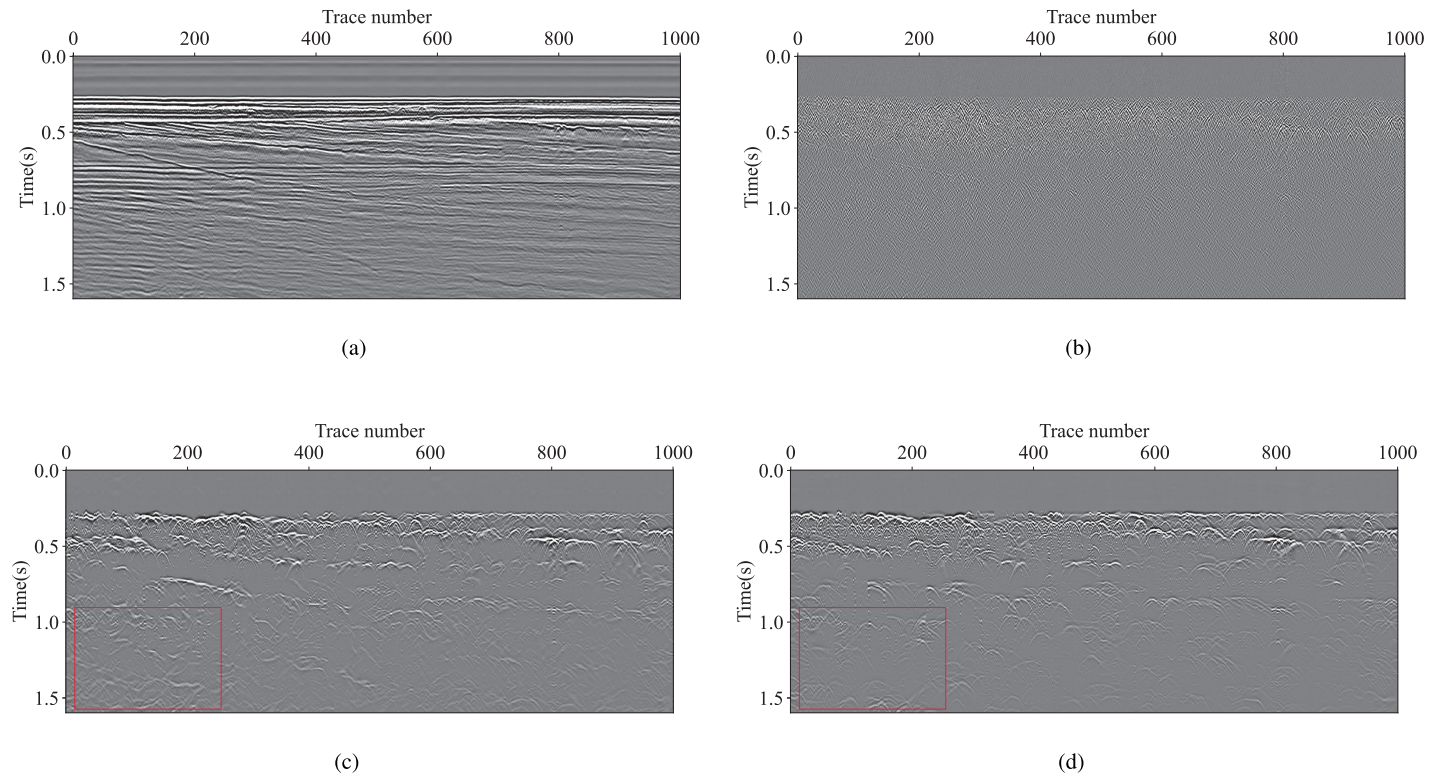 图3 Viking Graben实际数据示例 (a) 全波场数据;(b) PWD方法分离的绕射波;(c) U-Net网络分离的绕射波;(d) c-DDPM分离的绕射波