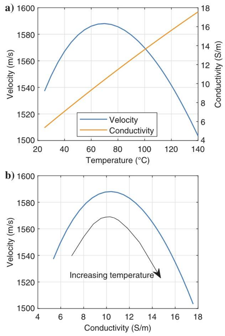 图2.(a)孔隙压力为1 MPa时,35 g/L氯化钠盐水的纵波速度与电导率随温度变化的模拟结果;(b)二者以温度为隐函数的联合相关性。箭头指示温度升高的方向。其中,弹性性质(纵波速度)的模拟依据Batzle和Wang(1992)的研究,电学性质(电导率)的模拟依据Sen 和Goode(1992)的研究