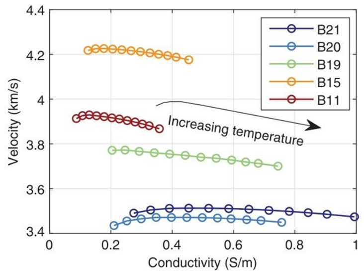 图1.五块盐水饱和Berea砂岩样品的实测纵波速度与电导率之间的相关性(以温度为隐函数)