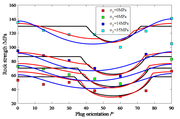 图1 三种各向异性强度准则对实验数据的拟合效果