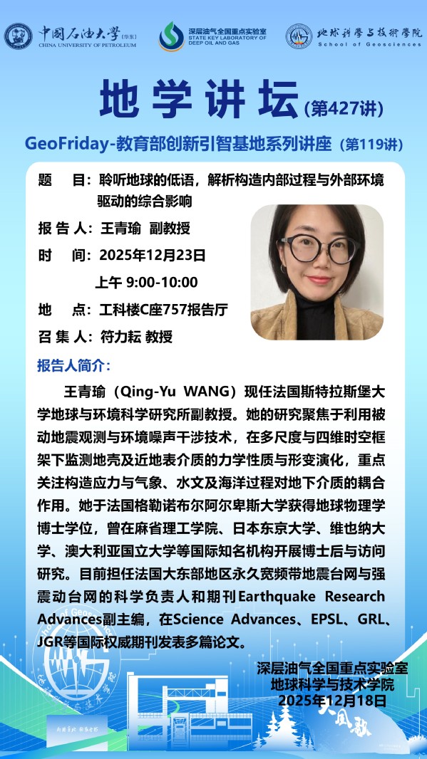 【地学讲坛第427讲】关于王青瑜副教授《聆听地球的低语,解析构造内部过程与外部环境驱动的综合影响》学术报告的通知