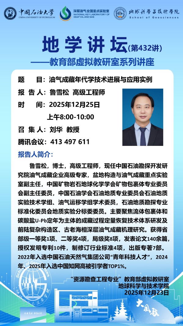 【地学讲坛第432讲】教育部虚拟教研室活动-关于鲁雪松 高级工程师《油气成藏年代学技术进展与应用实例》讲座的通知