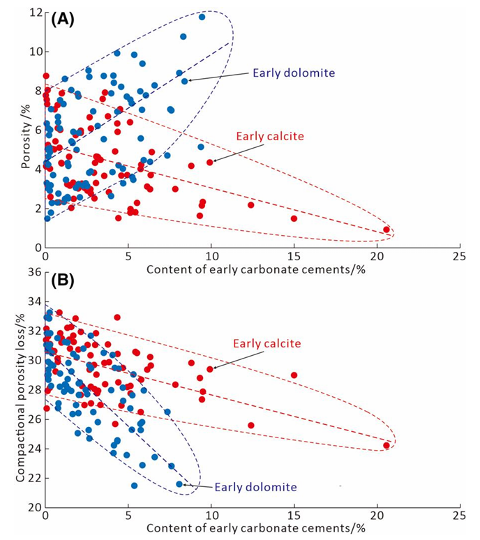 碳酸盐胶结物是碎屑岩储层中最常见的自生矿物之一,其形成贯穿整个成岩过程。长期以来,碳酸盐胶结物被视为破坏储层孔隙度的主要因素,因其充填孔隙、堵塞喉道,直接降低储层的孔渗性能。但现有研究往往将一套地层中发育的早期碳酸盐胶结物作为一个整体进行讨论,忽视了不同类型胶结物在成因、分布及其对储层影响上的差异,导致对储层演化机制的认识存在偏差。