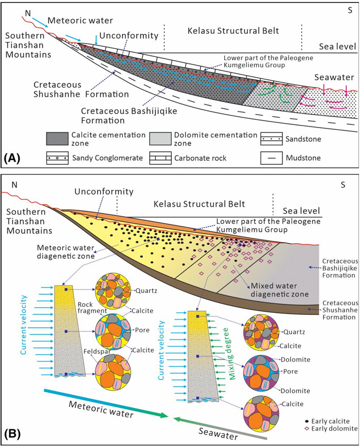 针对这一科学问题,以塔里木盆地库车坳陷白垩系巴什基奇克组超深层碎屑岩储层为研究对象,开展了系统的岩石学、地球化学和年代学分析,揭示了早期碳酸盐胶结物的分异特征、成因机制及其对储层质量的复杂影响。研究发现,早古近纪时期,大气水淋滤古近系碳酸盐岩,为白垩系储层提供了丰富的Ca²⁺、Mg²⁺和CO₃²⁻离子,成为早期方解石和白云石胶结物的主要物质来源。受大气水侧向补给、海水垂向补给以及正粒序层理的控制,早期方解石和白云石胶结物在储层中表现出显著的空间分布差异。方解石主要分布在研究区北部和不整合面附近以及正粒序砂体顶底,而白云石则主要分布在研究区南部和正粒序砂体的中部(图1)。