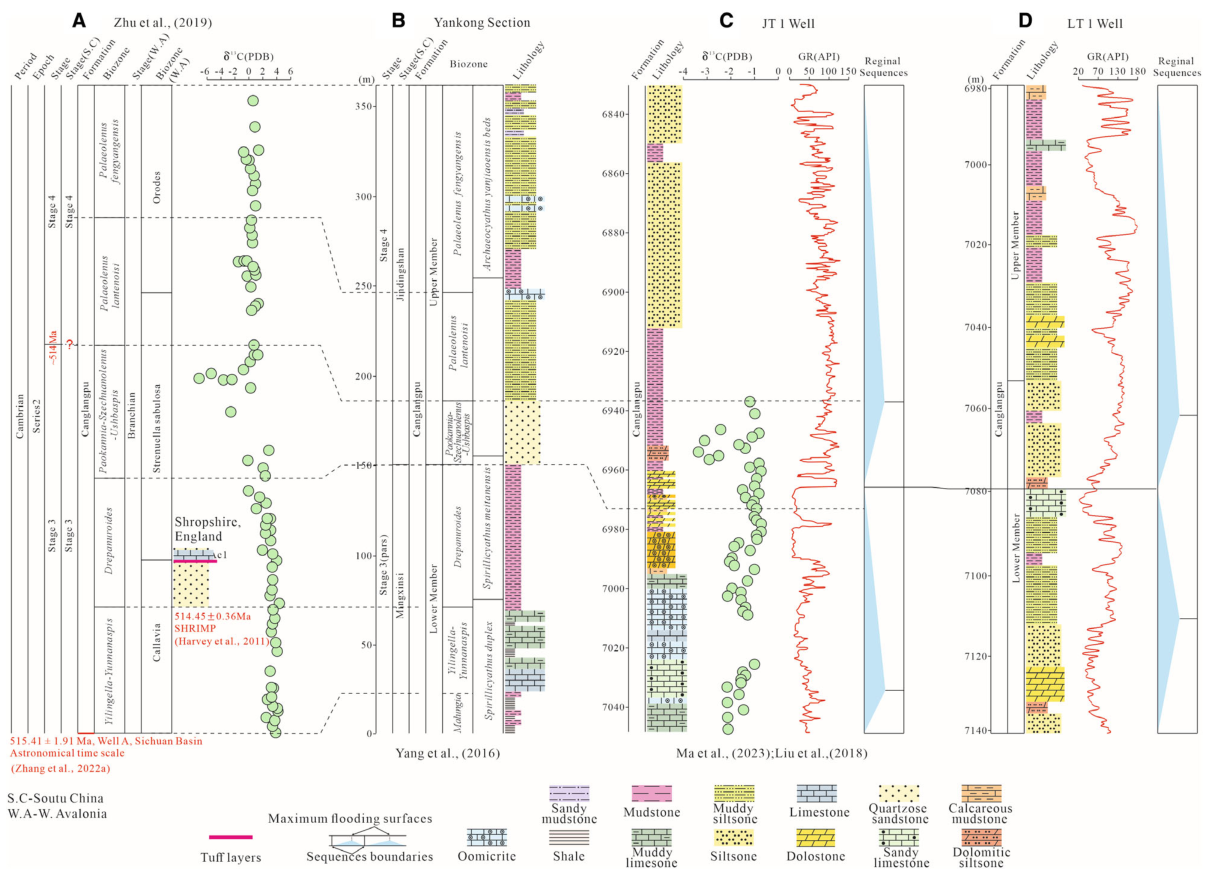 图1受年代地层学、生物地层学和岩石地层学约束的四川盆地晚寒武世地层对比。(A)华南板块晚寒武世地层划分(Zhu et al., 2019);(B)岩孔剖面(Yang et al., 2016);(C)JT1井(Liu et al., 2018; Ma et al., 2020);(D)LT1井(本研究)
