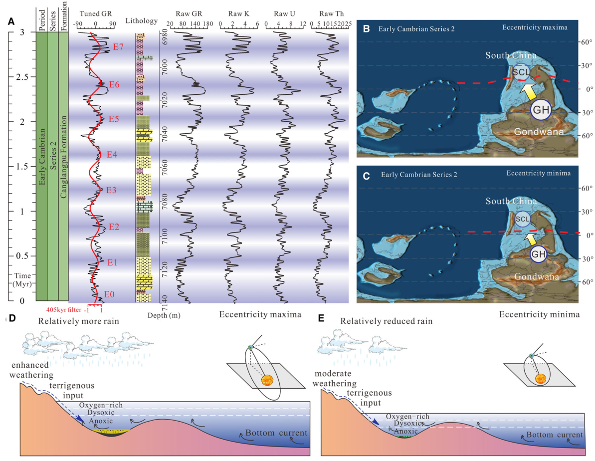 太阳辐射与行星引力对地球气候和碳循环施加着周期性影响,但在缺乏大规模冰盖的早寒武世温室气候背景下,其如何调控海平面变化与有机质富集过程,仍不明确。早寒武世(约5.15亿年前)是生物多样性爆发和有机质大规模埋藏的关键时期,解析这一时期海平面波动与有机质富集的驱动机制,是地球科学的前沿课题。四川盆地沧浪铺组发育连续、沉积记录完整(图1),处于浅水陆棚—台地过渡带,为研究天文轨道周期与气候—沉积耦合关系提供了理想载体。本研究将高分辨率旋回地层学与沉积噪声建模相结合,基于四川盆地超深钻井,系统采集了自然伽马、钾、铀、钍等地球化学测井数据。通过“Acycle”软件进行时间序列分析,在该套地层中识别出了对应405千年长偏心率、100千年短偏心率、斜率和岁差周期的米兰科维奇旋回信号,为沧浪铺组建立了一个跨度约300万年的高分辨率天文年代标尺,并对区内三叶虫和古杯动物带的持续时间提供了新的约束。沉积噪声模型成功重建了早寒武世的海平面变化曲线,揭示了偏心率和倾角对百万年尺度海平面波动的调控机制。研究表明,偏心率通过调控低纬度间热带辐合带的迁移,增强季风强度和陆源碎屑输入,促进了细粒沉积与有机质富集(图2)。