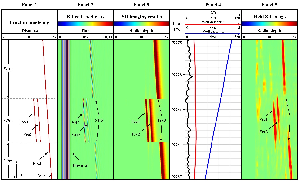 解析模拟和现场实测的SH横波远探测成像中显示近端裂缝存在而远端裂缝中间段不可见,解释了远探测中含油气裂缝被遮蔽而无法探测的现象。